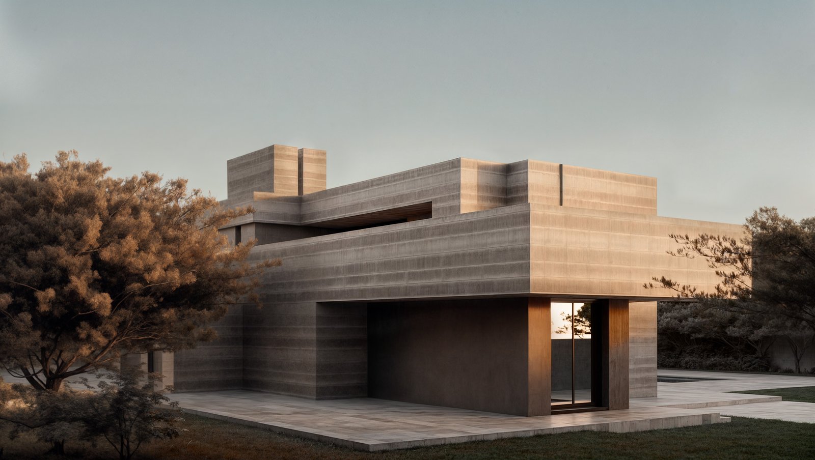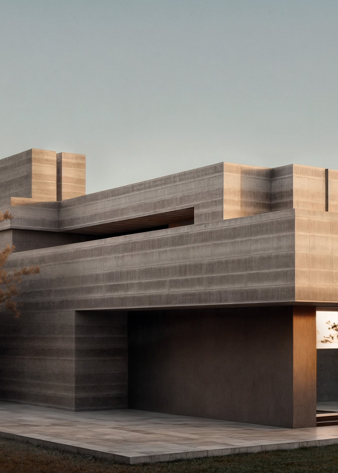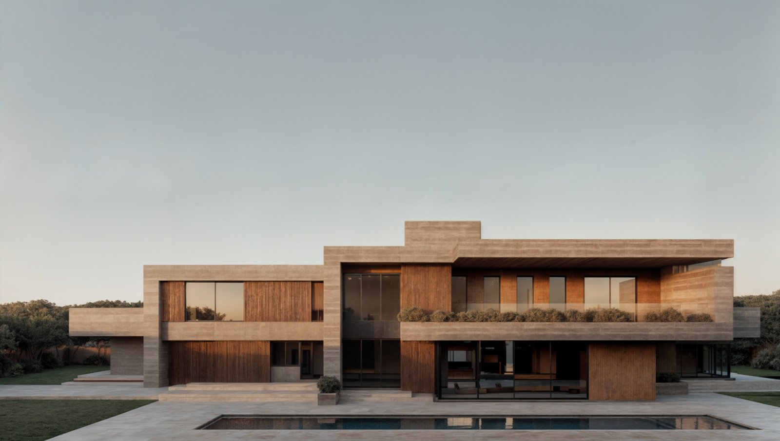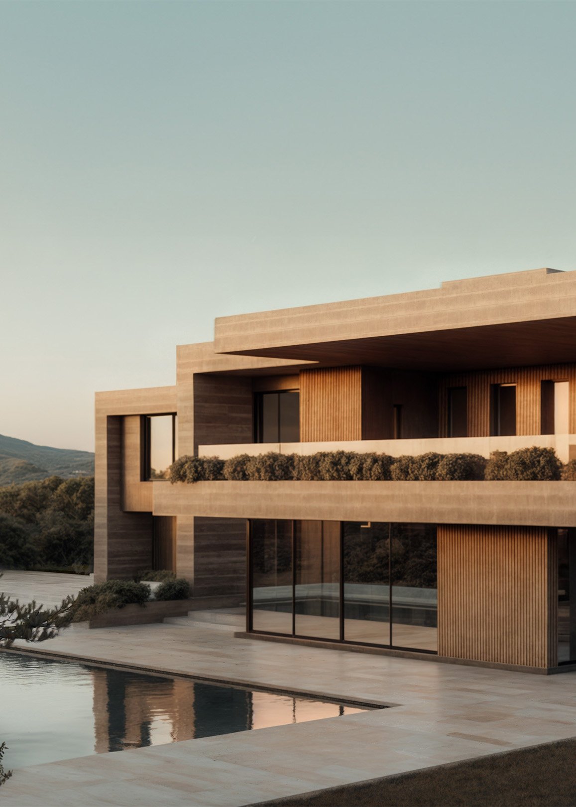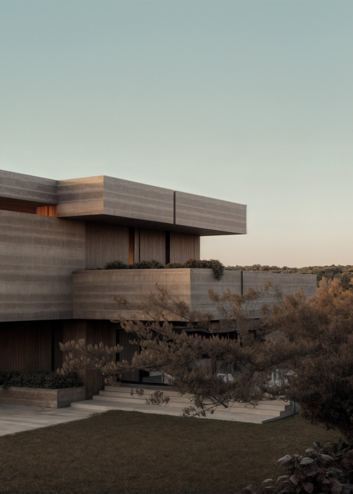 The façade departs from historical references to embrace a resolutely contemporary language. Defined by strong horizontality and sculptural layering, the architectural envelope employs a restrained palette of board-formed concrete and warm wood cladding. This limited material vocabulary allows the villa to achieve both a raw monumentality and a refined sense of tactility, with textures that respond to light and weathering over time.